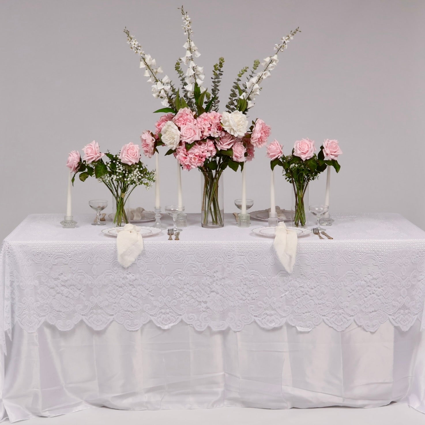 Easy to care for, our White Lace Rectangle Tablecloth can be machine washed and tumble dried, allowing for effortless maintenance.