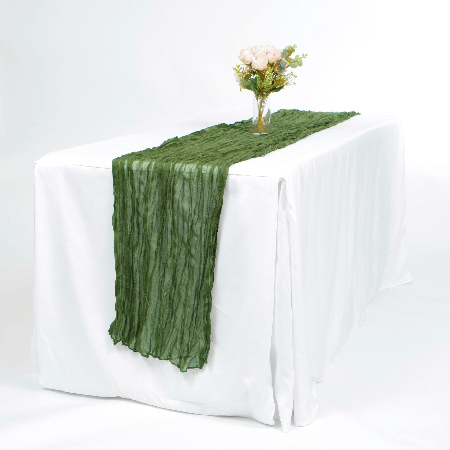 Introducing the enchanting Olive Cheesecloth Table Runner – a stunning addition to your event decor that effortlessly infuses Boho elegance into any setting. Also known as a gauze table runner, this exquisite piece captures the heart of your celebration with its natural crinkled texture and relaxed rustic charm.