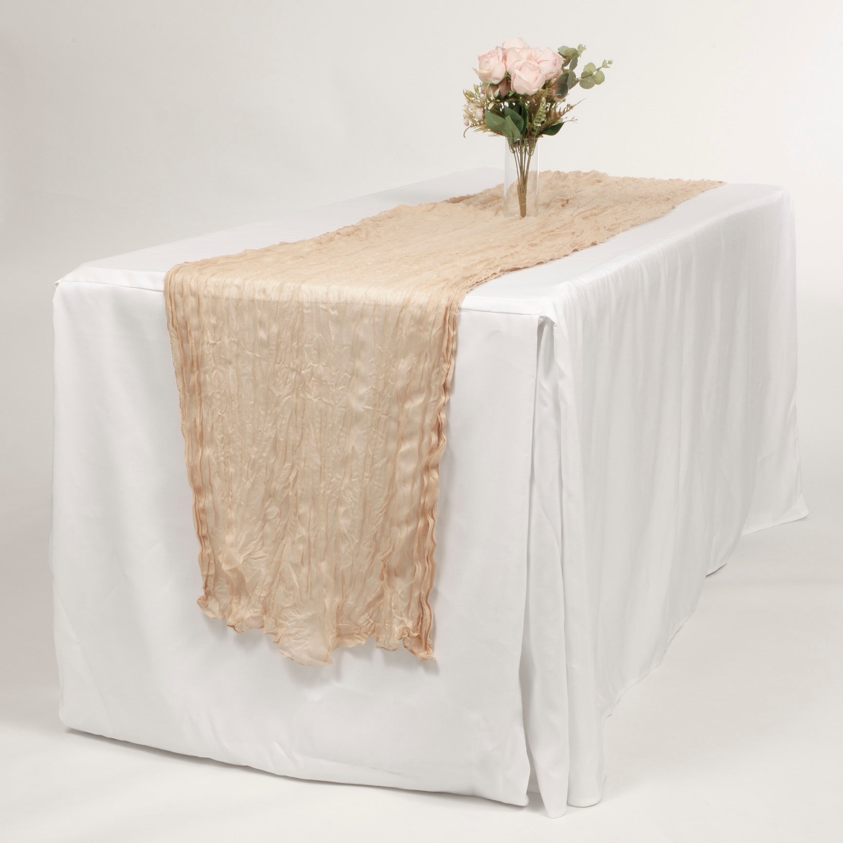 Introducing the enchanting Latte Cheesecloth Table Runner – a stunning addition to your event decor that effortlessly infuses Boho elegance into any setting. Also known as a gauze table runner, this exquisite piece captures the heart of your celebration with its natural crinkled texture and relaxed rustic charm.