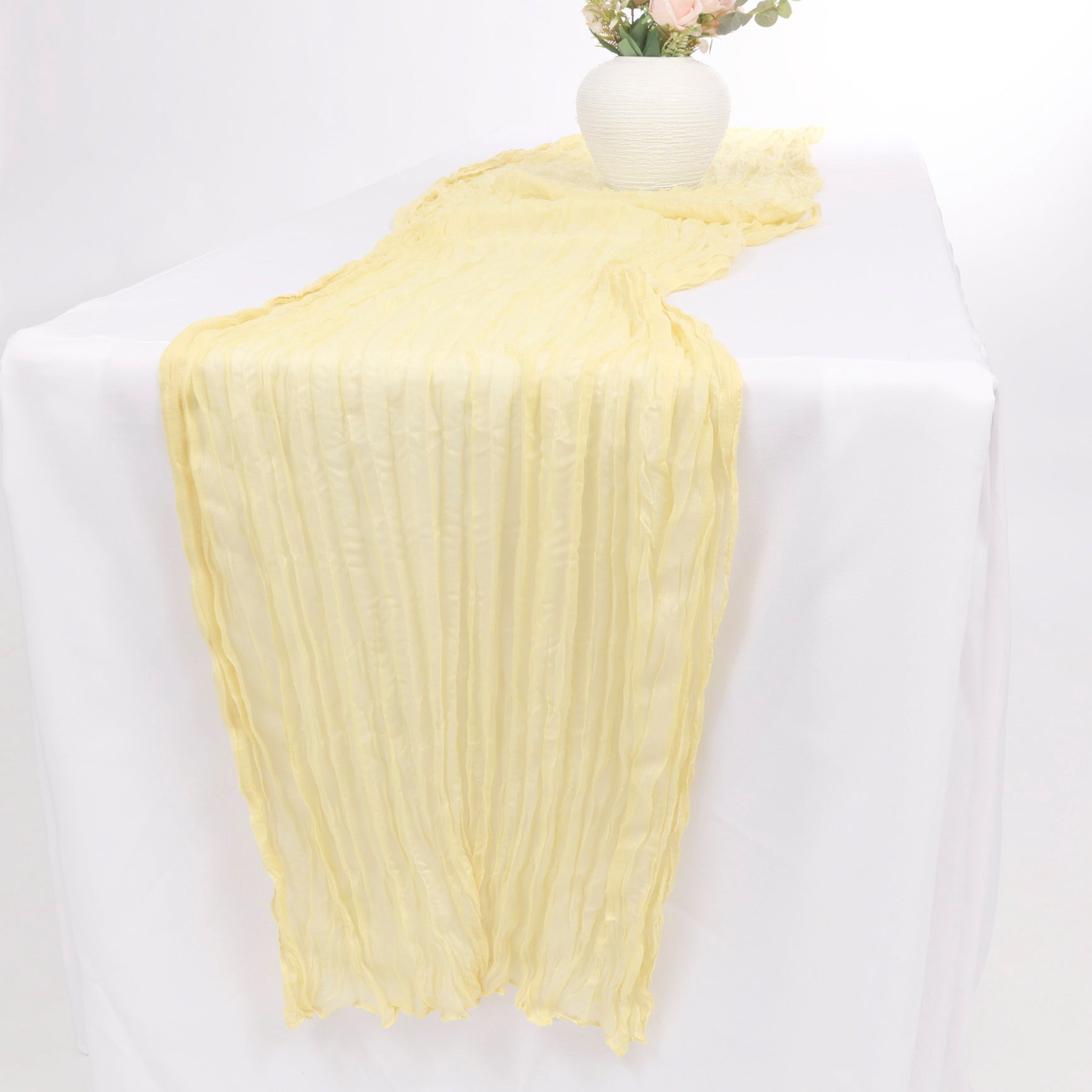 Introducing the enchanting Pale Yellow Cheesecloth Table Runner – a stunning addition to your event decor that effortlessly infuses Boho elegance into any setting. Also known as a gauze table runner, this exquisite piece captures the heart of your celebration with its natural crinkled texture and relaxed rustic charm.