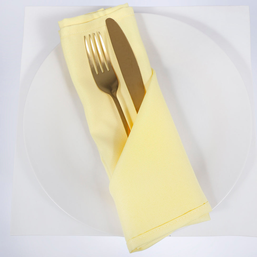Our Pale Yellow Cloth Napkins / Serviettes are classic in design and made from top grade EasyCare fabric, seamlessly stitched with a piece of whole fabric, with fold-over hem and square corners. Buy with confidence knowing you are purchasing one of our most popular wedding and event linen products. We have a huge range of colours to suit almost any colour theme.  It's time to transforms your event into a stylish masterpiece!